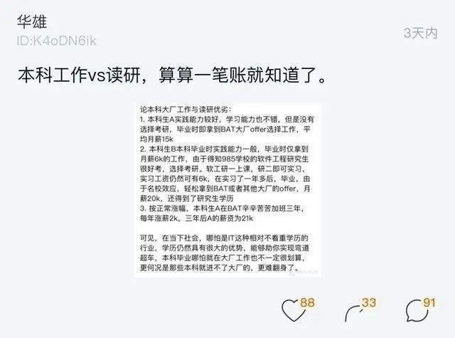 就有阿里员工拿自身举了一个反例,三年前本科毕业的已经在杭州买房了,现在p7,我现在p5,还没车。还有一位本科毕业加入阿里巴巴,就是楼主说的 A 放弃读研去工作的,一年工资就涨到了21k,然后提前买房,目前房子涨了一百多万,他感慨说,如果当初要是去读研,鬼知道会怎样。