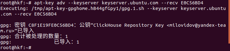 1. Yandex维护着一个拥有最新版ClickHouse的APT存储库。 添加存储库的GPG密钥,以便您能够安全地下载经过验证的ClickHouse软件包:
