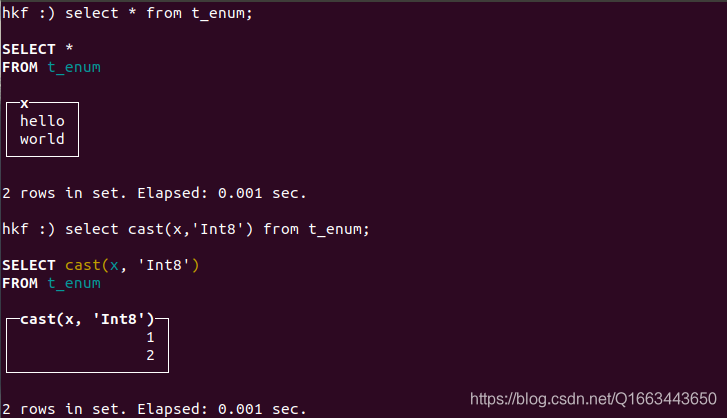 这个x列只能存储类型定义中列出的值:‘hello’或者‘world’,插入其他值会报错。
