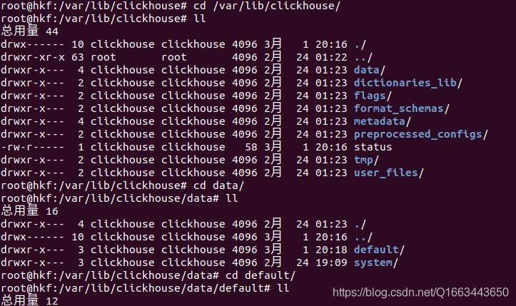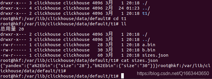 如上图所示,进入刚才创建的t1,可以看到a.bin,b.bin,sizes.json三个文件,其中前两个是压缩过的对应的列的数据,sizes.json则记录了每个*.bin的大小。
