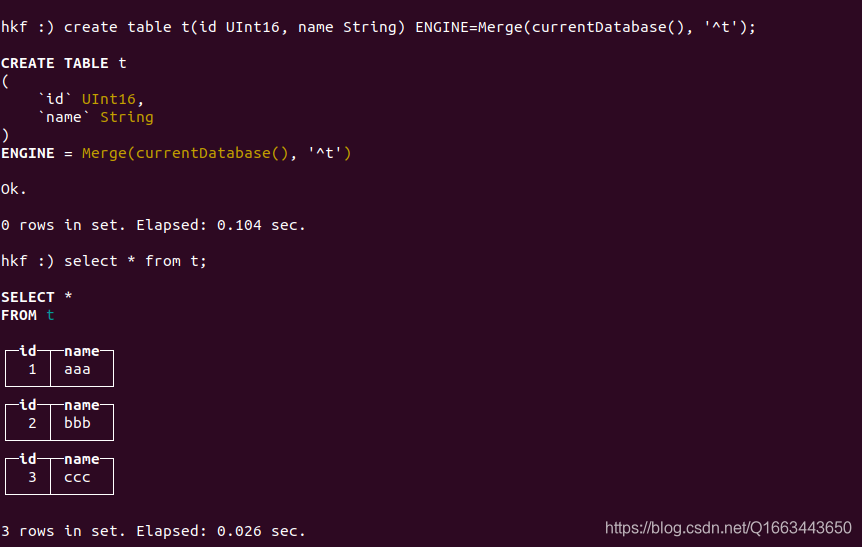 例:先建t1,t2,t3三个表,然后用Merge引擎的t表把他们链接起来。