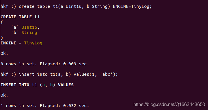 例:创建一个TinyLog引擎的表并插入一条数据。