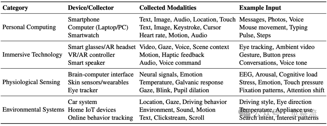 智能手机收集文本、图像、音频、位置和触摸信息(消息、照片、语音);智能眼镜捕捉视频、注视、语音和场景上下文(眼动追踪、环境视频);脑机接口记录神经信号和情绪状态(EEG、唤醒度、认知负荷);车载系统监测位置、注视和驾驶行为(驾驶风格、视线方向)。这张表详尽列举了个人计算设备、沉浸式技术、生理感知和环境系统等类别的代表性采集器。