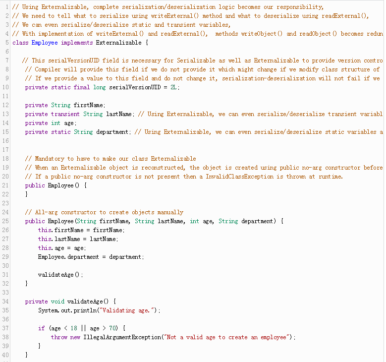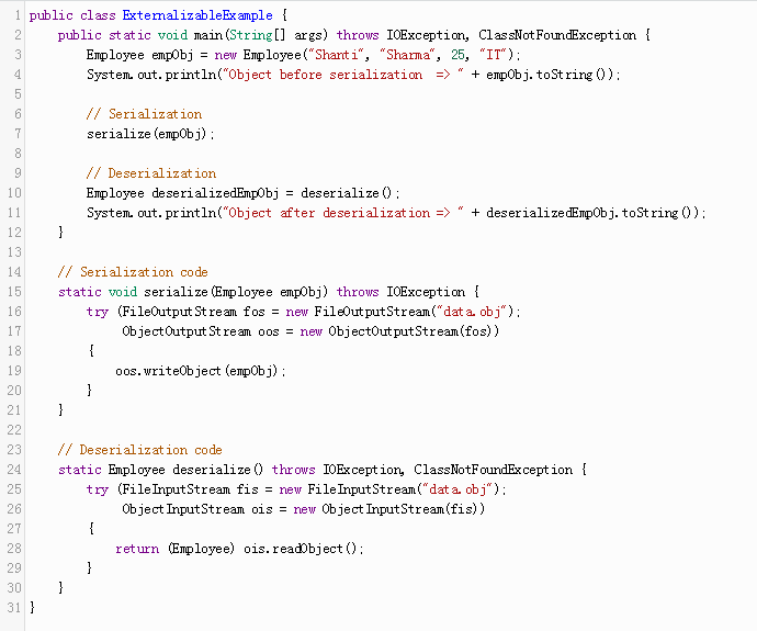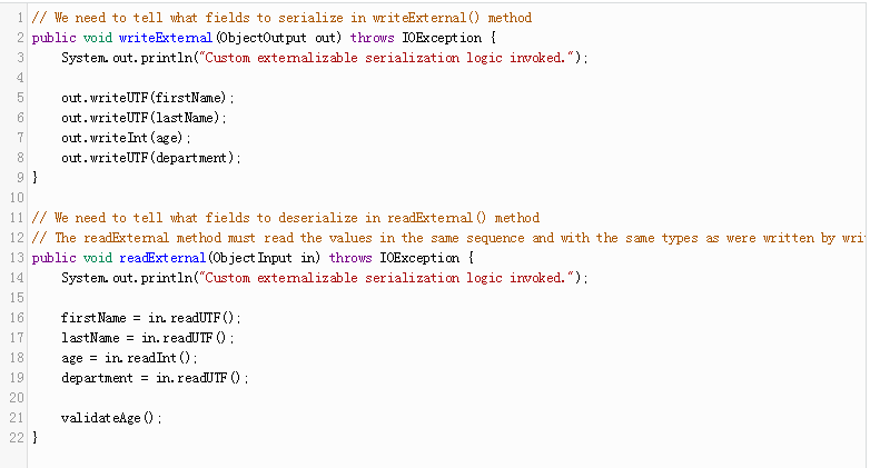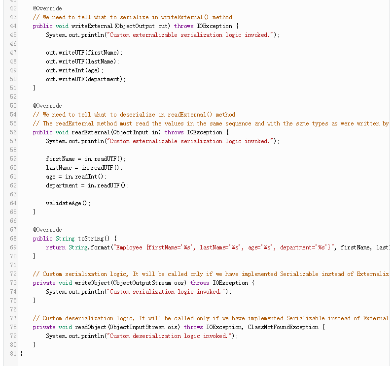 正如我们上面看到的,在我们的例子Employee类,我们可以通过实现写自己的序列化逻辑外部化的界面和重写它的方法writeExternal()和readExternal()。