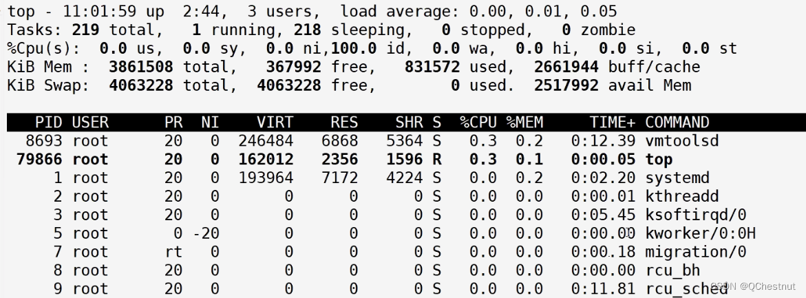 (1)top - 11:02:29 up 2:44, 3 users, load average: 0.00,0.01,0.05