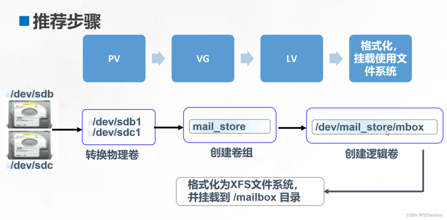若干个磁盘分区或者物理磁盘,合并成一个逻辑卷组,再把这些逻辑卷组划分成一个个的逻辑卷 用户就可以把逻辑卷看做是一个可动态扩容,快速创建,快速分区的分区