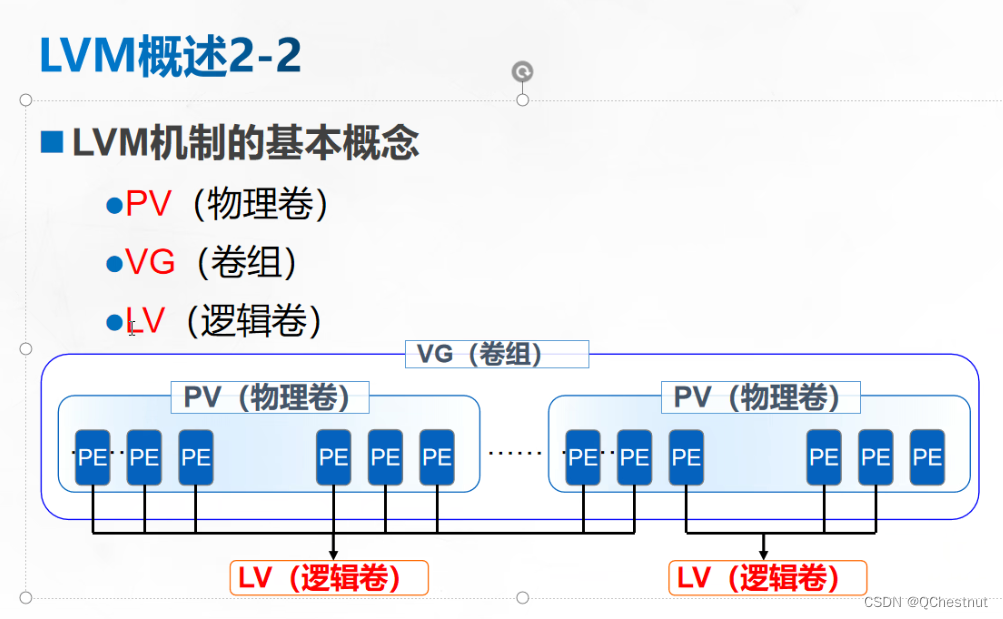 VG:卷组,把物理上的分区结合起来就形成了卷组。卷组就是逻辑上的硬盘