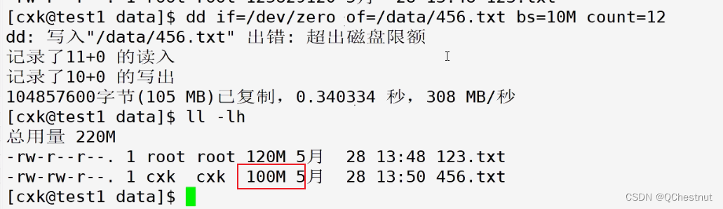 bhard:硬限制,到了指定的配置就不可以继续写入了,100M