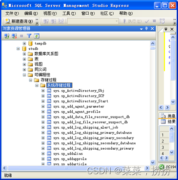 在命令窗口依次执行如下SQL命令:EXEC sp_databases;EXEC sp_tables;EXEC sp_columns S(查询当前数据库studb中数据表S的列的信息);EXEC sp_help S(查看数据表S的信息)。系统存储过程可通过图7.1方式查询,可自行练习执行其他的系统存储过程。