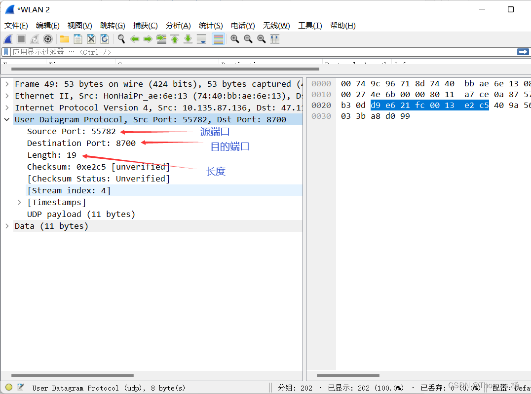 在抓取的UDP用户数据报中,源端口为55782,目的端口为8700,数据报的长度为19;