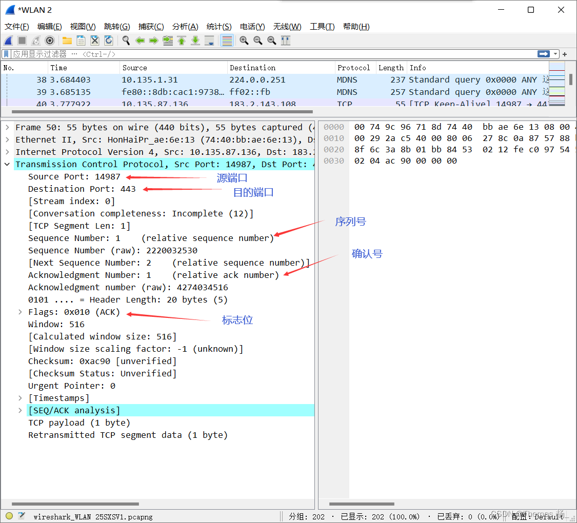 在抓取的TCP报文段中,源端口为14987,目的端口为443,序列号和确认号都为1,标志位为0x010。