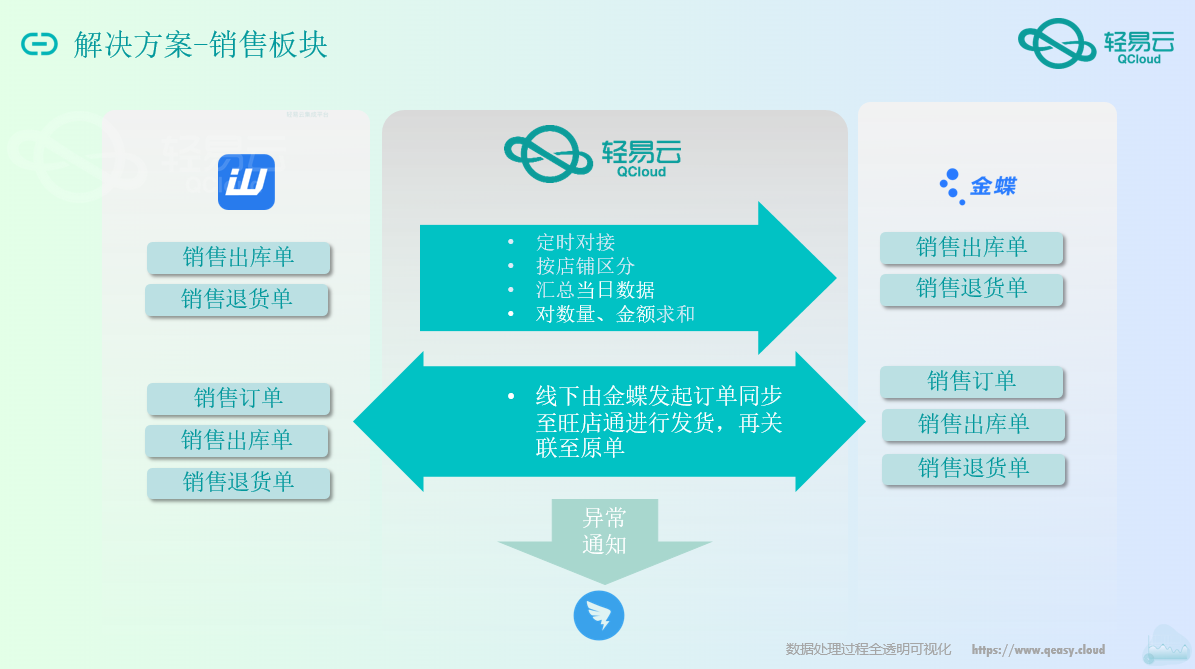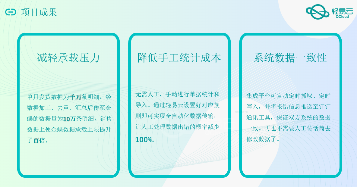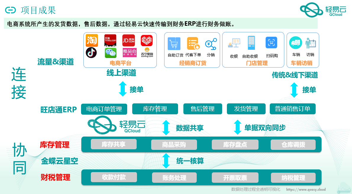 通过集成平台帮助客户实现大数据合并,优化了金蝶云星空可承载海量的B2C电商销售数据最后进行财务统一做账