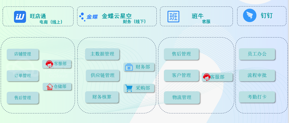 主要集成旺店通和金蝶云星空,实现系统数据的销售业务,库存业务,主数据的对接等。