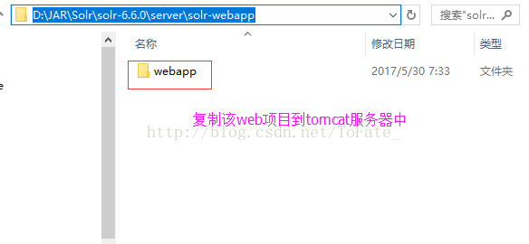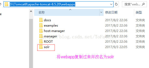 - 解压后的Solr中有一个server目录,进入server目录,紧接着进入solr-webapp目录,复制solr-webapp目录下的webapp文件夹至tomcat的webapps目录下,并将复制过来的webapp文件夹改名为solr(ps:复制过来的就是一个Java Web项目,因此此处不进行改名也可以,不改名的话项目名称就是webapp,改名后项目名称为solr,有一点Java Web经验的朋友对此处应该能够很容易理解)。