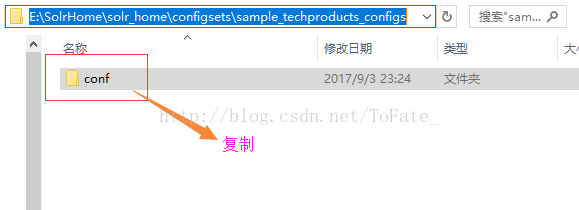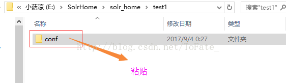 - 将solr_home下的configsets目录下的sample_techproducts_configs目录下的conf文件夹复制到test1中: