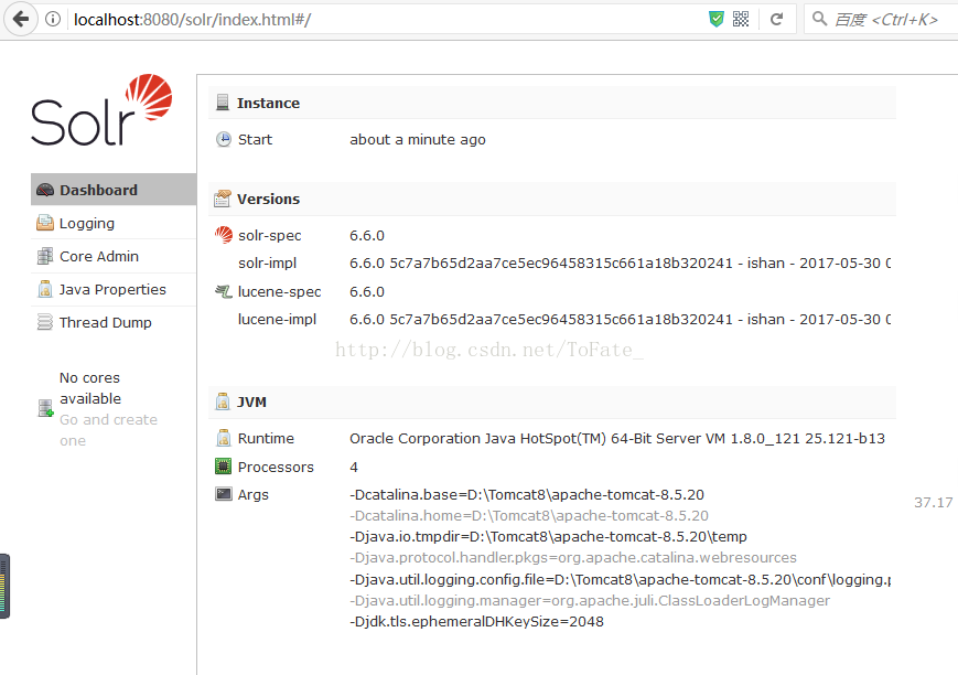 - 开启tomcat服务器,访问http://localhost:8080/solr/index.html,(ps:按道理来说只要访问http://localhost:8080/solr就能成功访问才对,但是solr6.6必须还得在后面加上index.html才行,有朋友知道是什么原因的话可以跟我说一下),如下图所示: