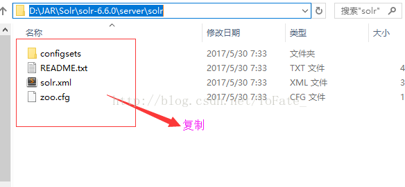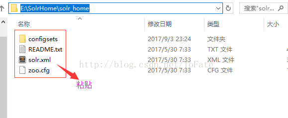 - 解压后的Solr中有一个server目录,进入server目录,紧接着进入solr目录,将目录中所有内容复制到创建的solr_home中,如下图: