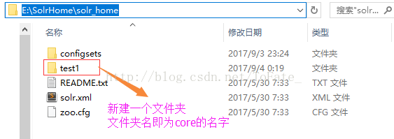 - 进入solr_home(ps:前面已经将相关配置文件复制到了solr_home中,没有复制的朋友看看前面相关操作),创建一个名为test1的文件夹: