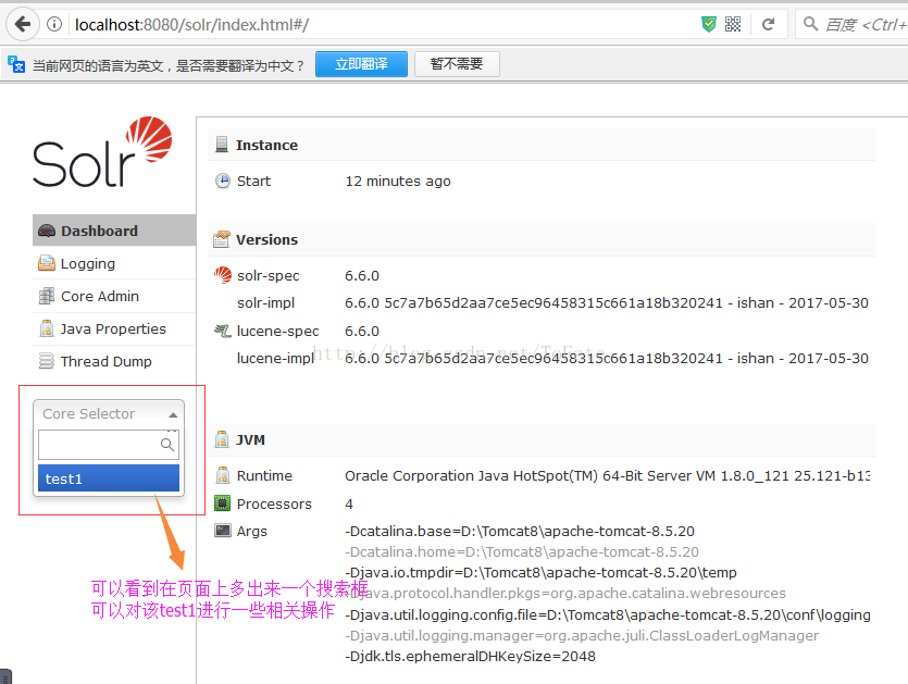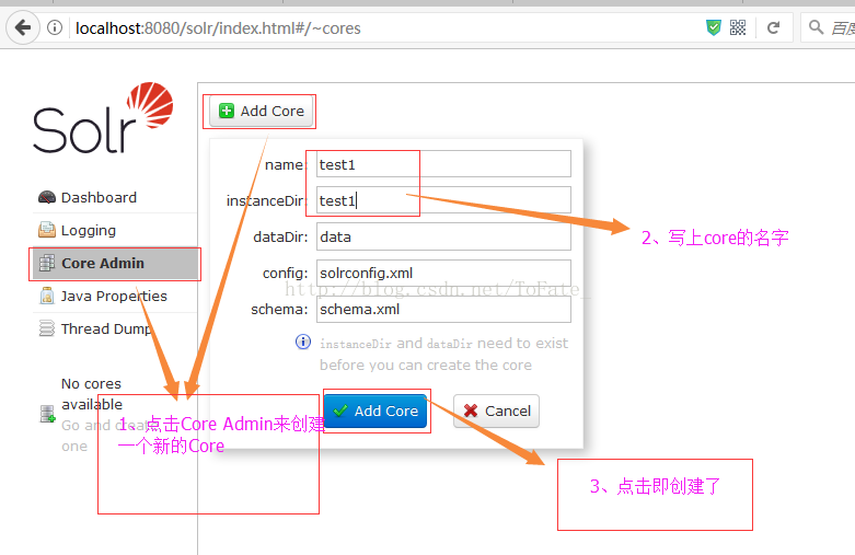 - 访问http://localhost:8080/solr/index.html,进行如下操作: