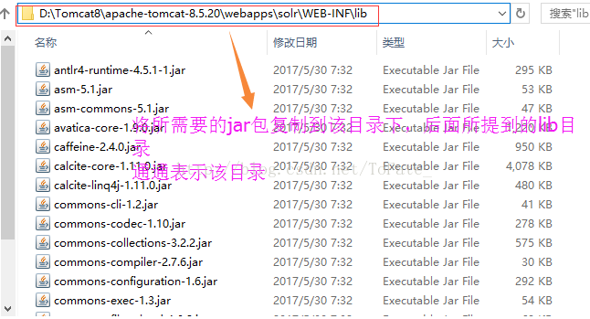 - 复制solr-6.6.0\server\lib\ext下的所有jar包到tomcat下的webapps\solr\WEB-INF\lib目录下