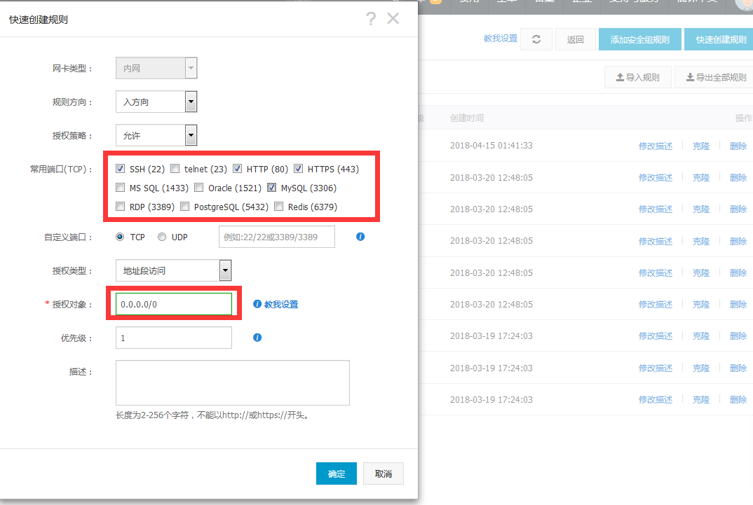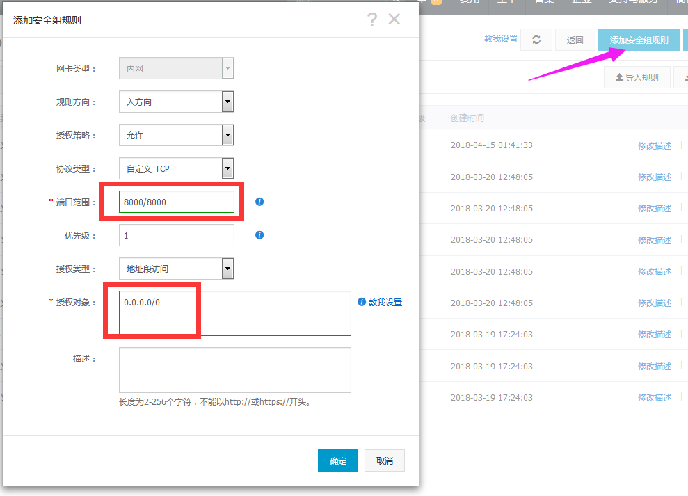 还要添加一个安全组规则,设置端口范围,授权对象,点确定