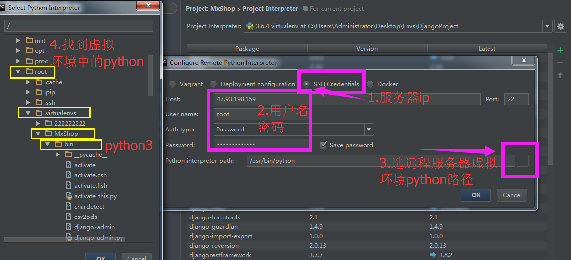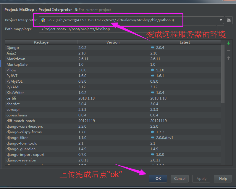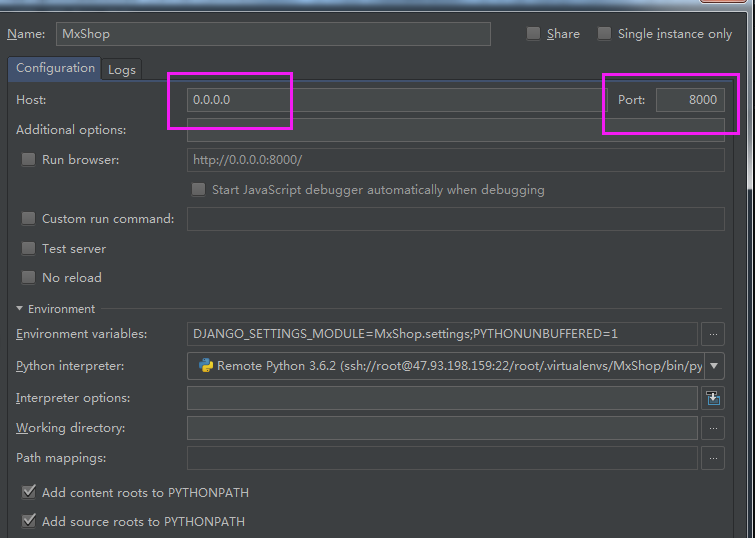 pycharm 的interpreter设置为服务器虚拟环境的python ,这样相当于在服务器上运行项目了