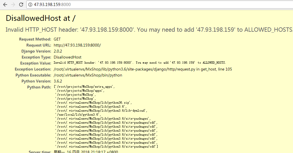 settings里面必须设置允许的HOST,数据库里面HOST也要设置为服务器的ip