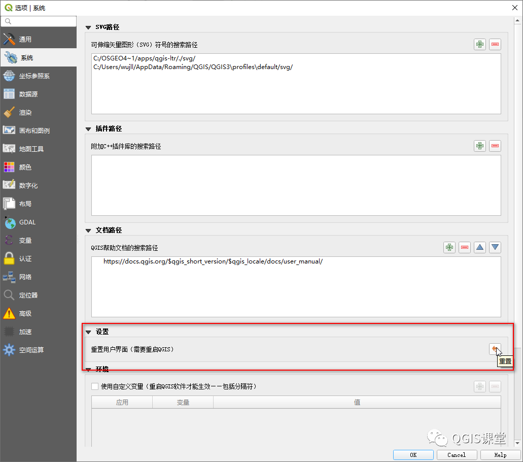 点击菜单【设置】->【选项】,打开全局选项对话框,切换到“系统”标签页,找到下方的【设置】->【重置用户界面(需要重启GIS)】,点击右侧的