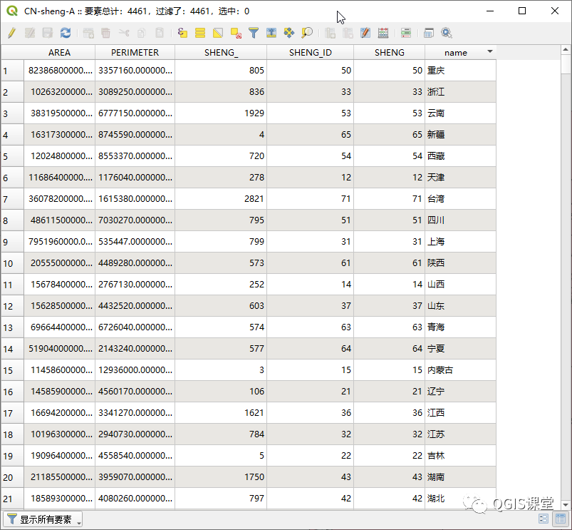 为了对比,打开行政区划图层“CN_sheng_A”的属性表,可以看到原始数据包含了AREA、PERIMETER、SHENG_、SHENG_ID、SHENG、name共6个字段。
