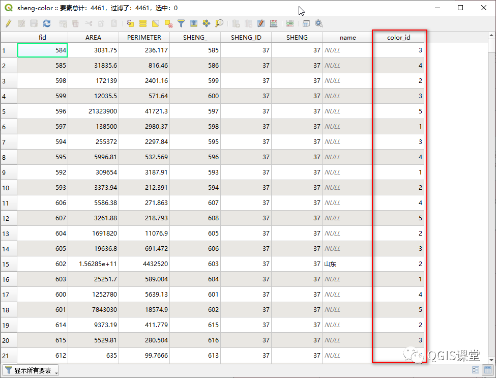 算法运行结束后,点击【Close】返回QGIS地图窗口。可以看到【图层】面板中添加了新图层“sheng-color”。右键点击该图层,打开属性表窗口。