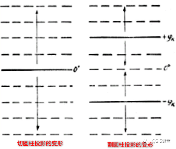 在切圆柱投影中,赤道上没有变形,自赤道向两侧随着纬度的增大变形增大。在割圆柱投影中,两条标准纬线上没有变形,自标准纬线向内(向赤道)及向外(向两极)增大。