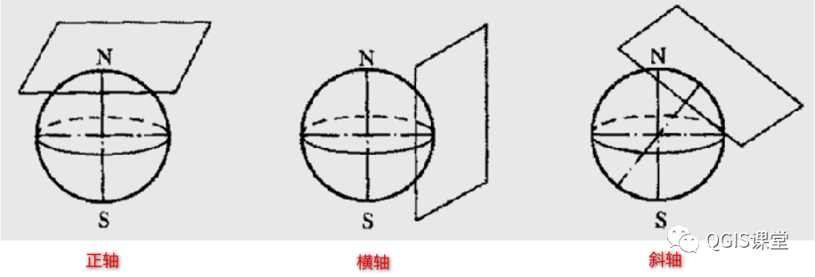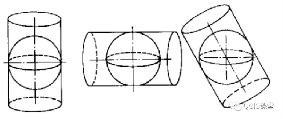 根据圆柱轴与地球地轴的位置不同,又分为正轴、横轴和斜轴圆柱投影三种。