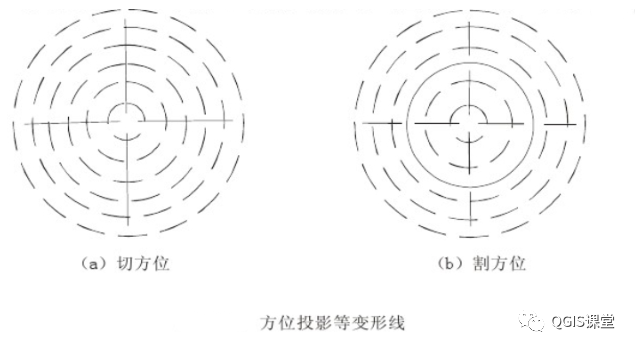 在割方位投影中,在所割的小圆上无变形,长度变形与面积变形自所割小圆向内与向外增大。