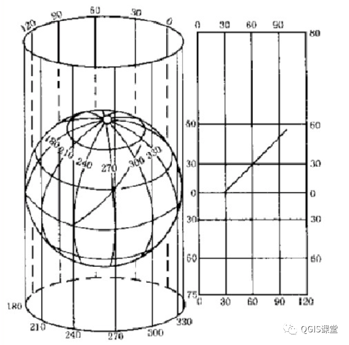 以圆柱面作为投影面,把地球上的经纬线网投影到圆柱面上,然后沿着圆柱面的一根经线剪开展成平面,就得到圆柱投影。