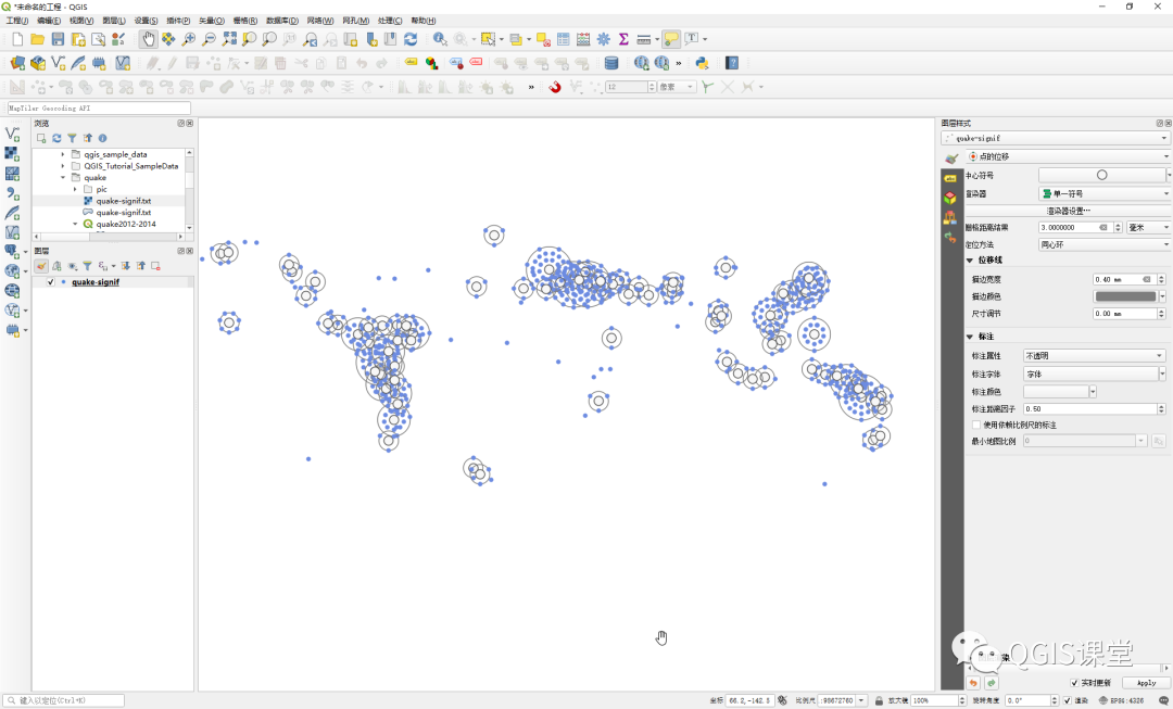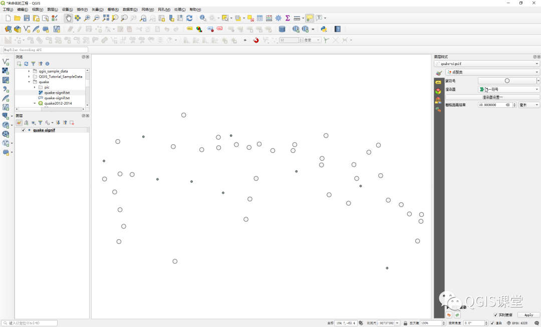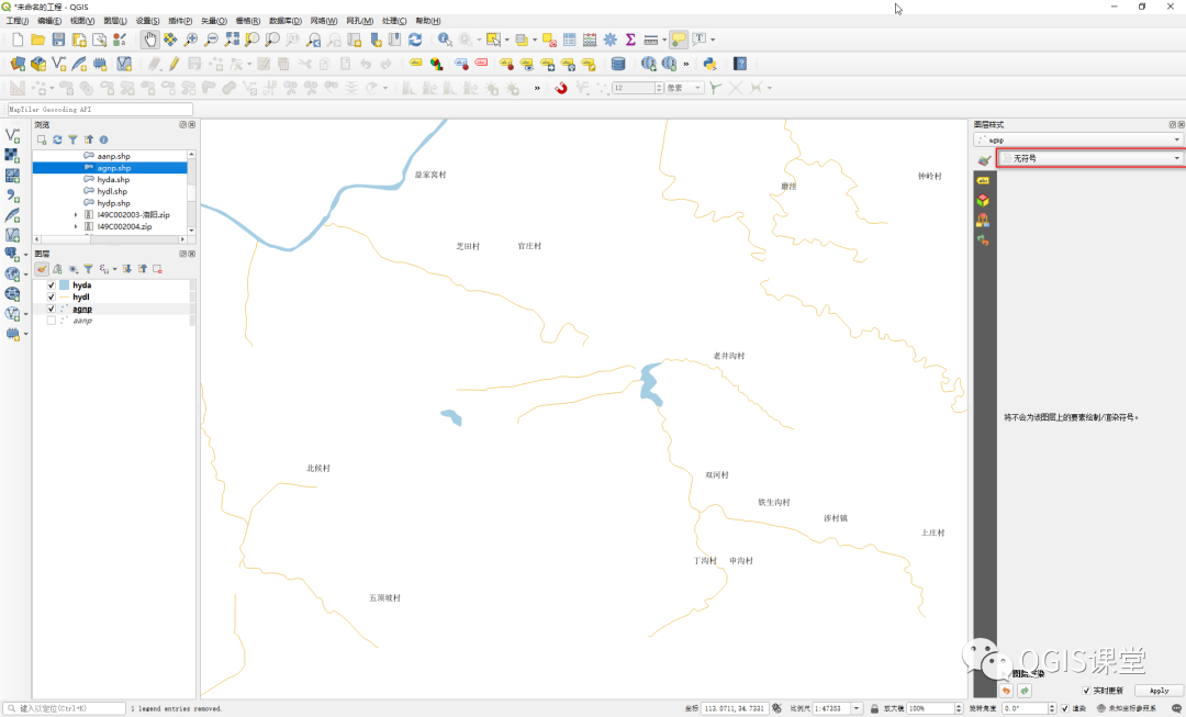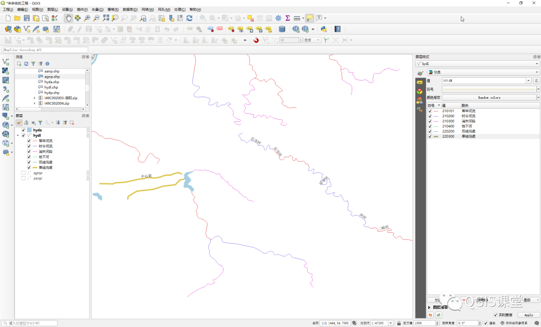 数据加载到地图窗口时,QGIS会根据数据的几何类型(点、线、面)提供默认的渲染方式。