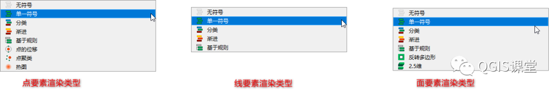打开【图层样式】面板或者【图层属性】的符号化标签,可以切换不同的要素渲染方式。