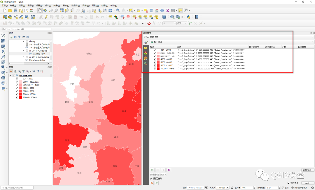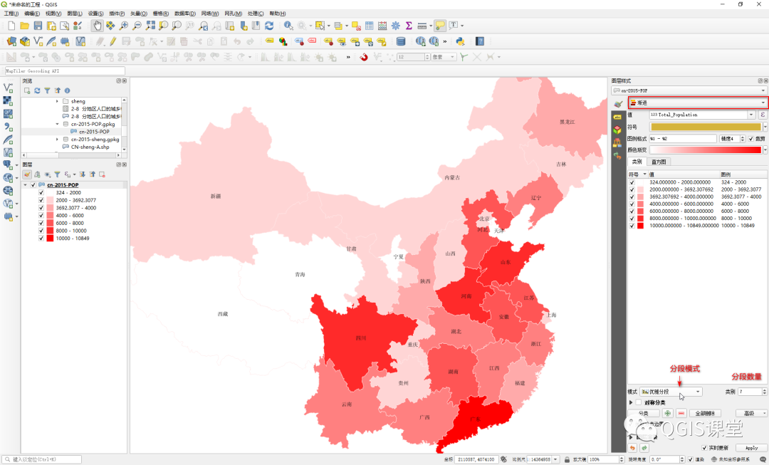 QGIS提供优雅分段、对数尺度、标准差、等数量(分位数)、等间隔、自然间断点 六种分级模式,选择不同分级模式将影响到落入每个等级的要素数量。