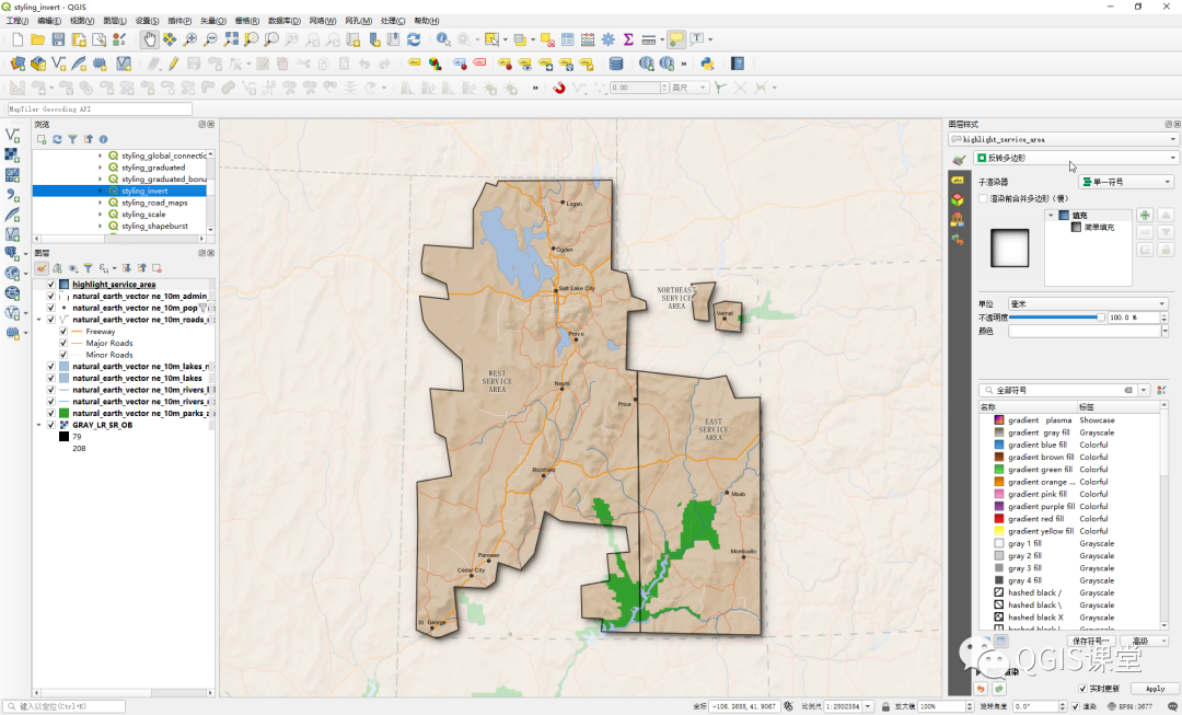 反转多边形是面图层特有的渲染方式,用于渲染多边形之外的区域,类似基于多边形要素在地图画布中挖了一个洞,在地图设计中经常用于突出显示研究区域。