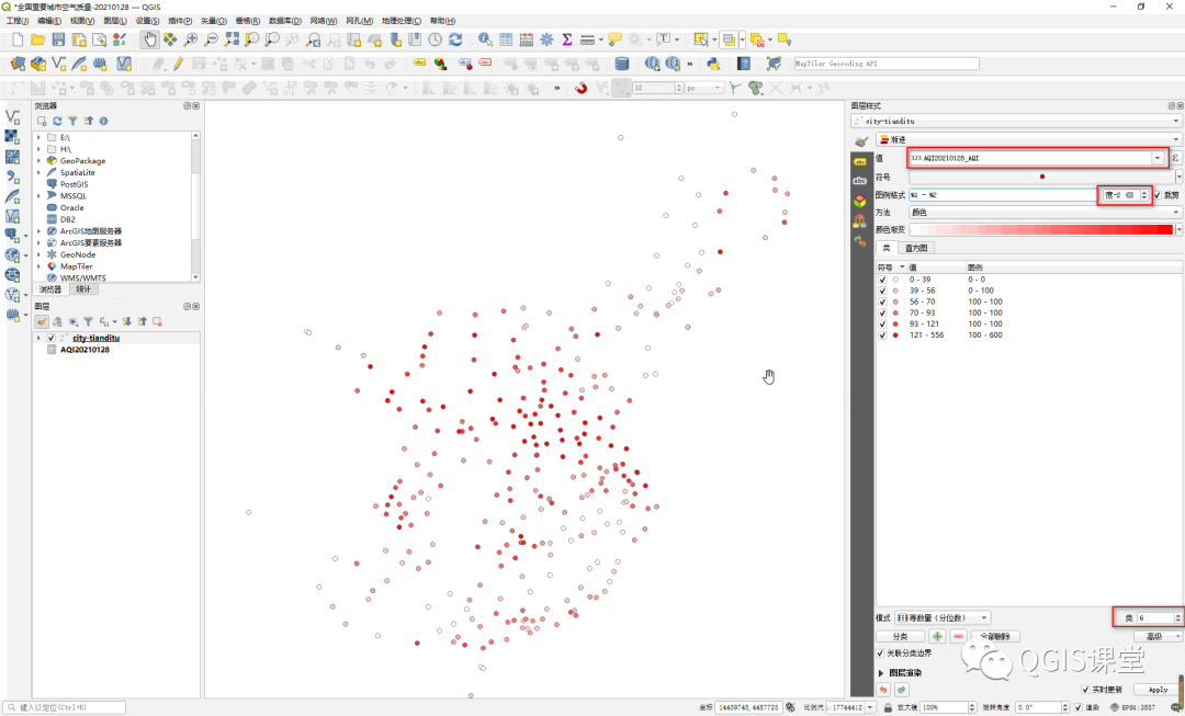点击【分类】按钮,将城市的AQI分为6个等级,如下图: