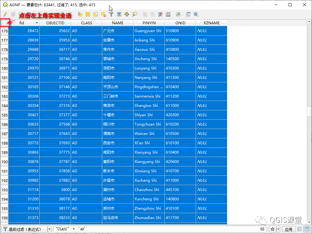 点击【OK】完成表达式筛选,返回属性表窗口,共过滤出415个要素,点击表格左上角,选中所有过滤结果: