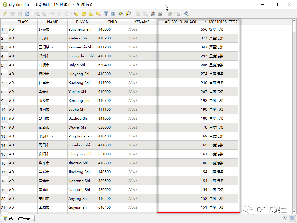 关闭图层属性对话框,返回QGIS主窗口,打开城市点图层的属性表窗口,可以看到属性字段增加了AQI、空气质量和城市,说明AQI数据已经连接到城市点图层: