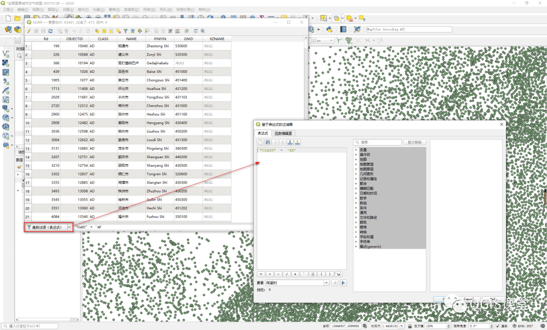 点击属性表窗口左下角的下拉菜单,选择【高级过滤(表达式)】,打开表达式字符串过滤器,输入下列表达式筛选出城市点: