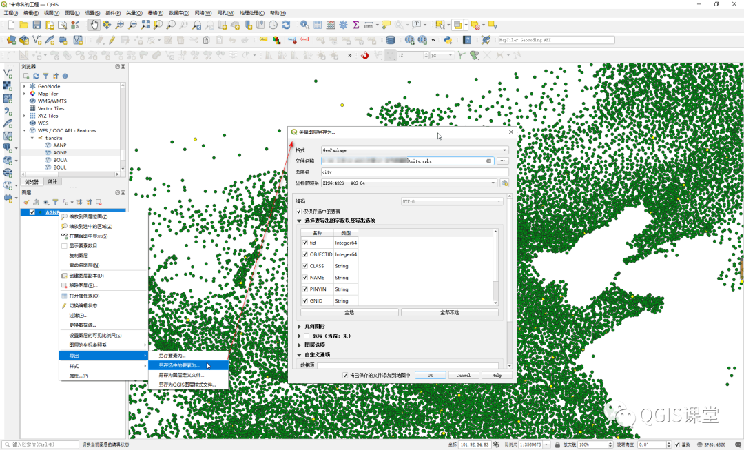 切换到QGIS地图主窗口,右键点击【图层】面板->【AGNP】->【导出】->【另存选中的要素为…】,弹出【矢量图层另存为】对话框,设置如下参数: