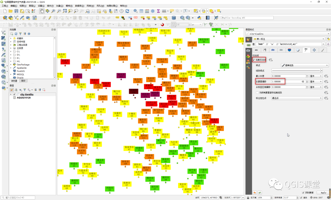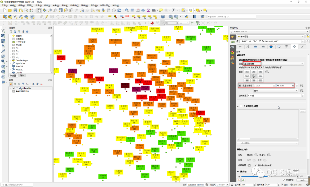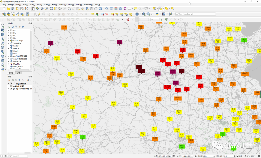 本文以生态环境部今天(2021年1月28日)发布的实时空气质量指数为例,通过QGIS演示空气质量指数地图制作过程,展示QGIS点数据分级可视化和表达式生成文字标注技巧,最终的效果图如下: