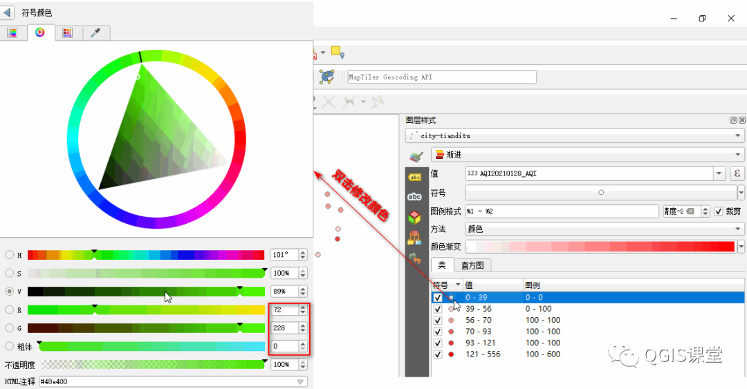 默认的分级断点和样式与我国的标准并不一致,需要手工调整。首先,修改一级AQI的符号颜色为标准规定的绿色,RGB值为(72, 228, 0):双击分类第一行中的【符号】, 在符号图层选中【标记】->【简单标记】->【填充颜色】->【选择颜色】,分别填入颜色的R、G、B分量:72, 228, 0。