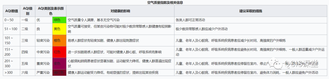 根据我国生态环境部科技标准司于2012年发布的《环境空气质量指数(AQI)技术规定(试行)(HJ 633—2012)》,我国的空气质量指数可以分为六个等级,具体分级标准如下: