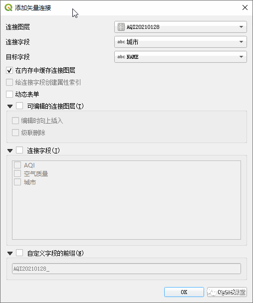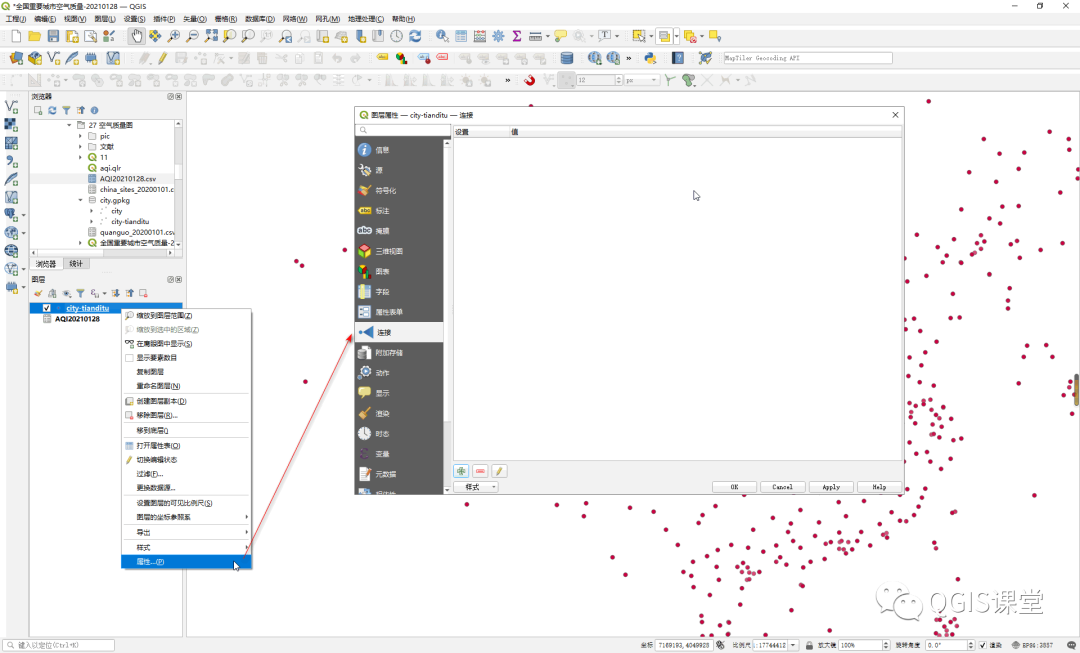 最后,建立空气质量指数与城市点数据的连接。在【浏览器】面板找到上一步骤保存的城市点图层和空气质量指数,拖拽到地图窗口。右键点击城市点图层->【属性】->【连接】: