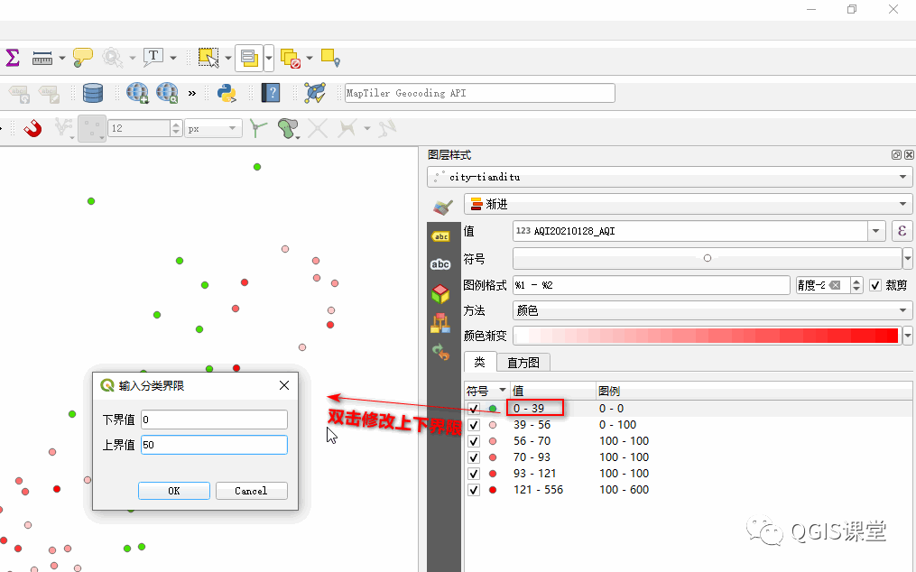 第二步,修改分级的上下限。双击第一行的【值】,弹出上下限设置对话框,输入【下界值】为0;【上界值】为50: