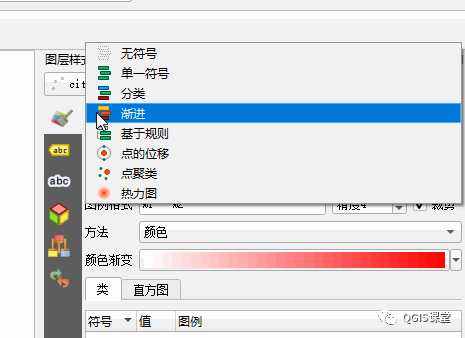 使用QGIS的“渐进”渲染,可以将上述标准表达在地图上。