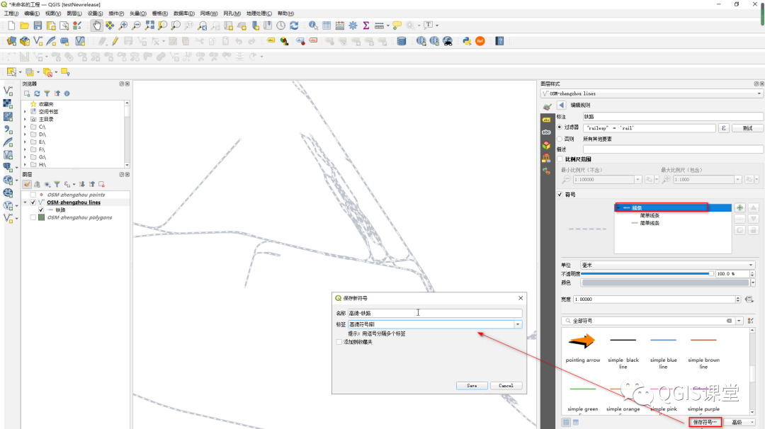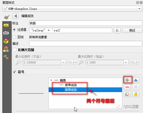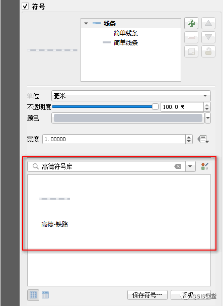 在QGIS中,高德地图中铁路符号的效果需要2个符号图层(symbol layer)组合而成:深灰色的符号图层作为底色,上面叠加白色的线段。因此,先点击